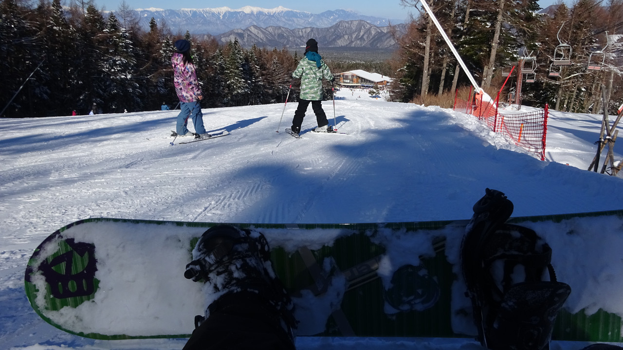 その前の草津スキー場が初回で、一緒に行ったI氏とF氏にスノボの初歩を教えてもらって、次に行った白樺湖&霧ケ峰高原が練習その2とその3。