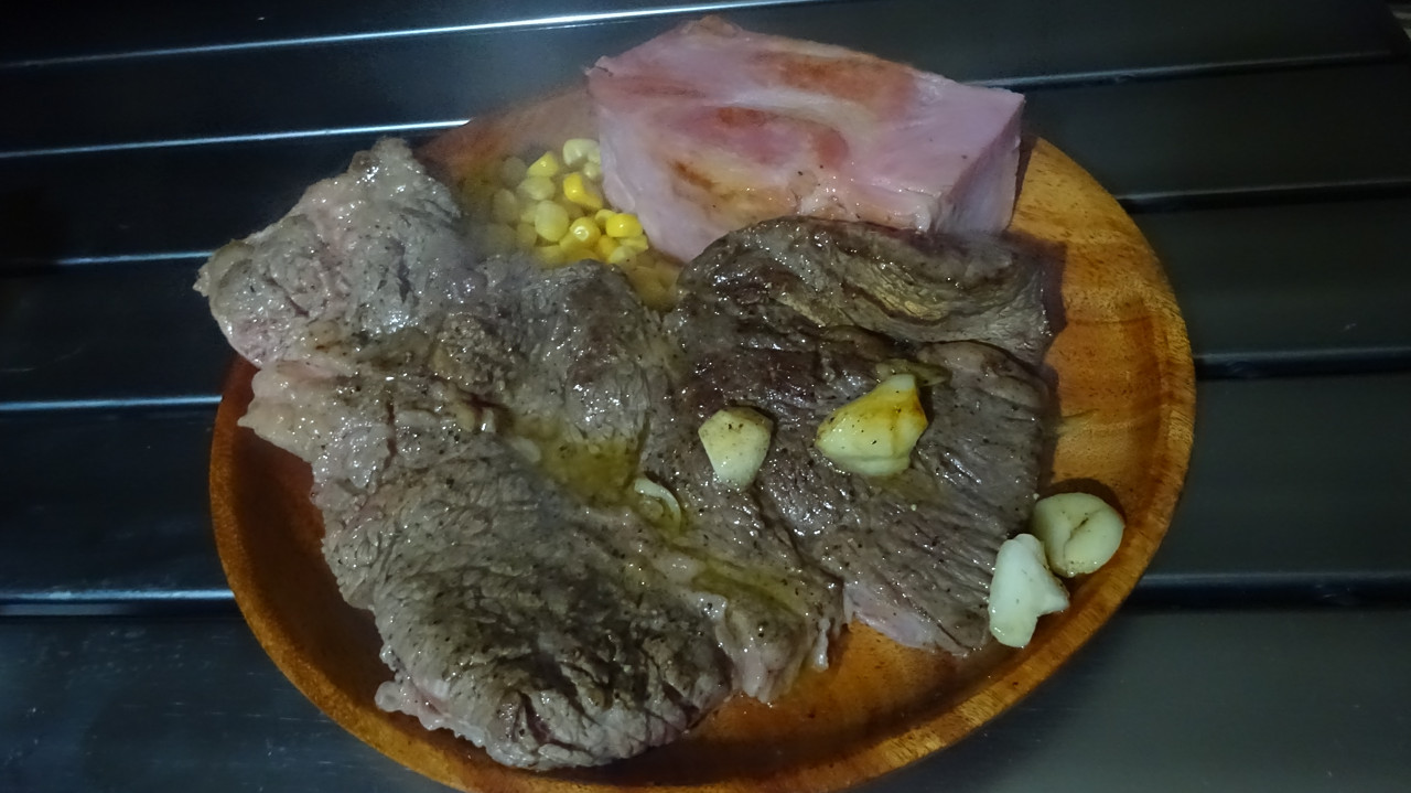 付け合わせはコーンと、なぜか厚切りベーコン。