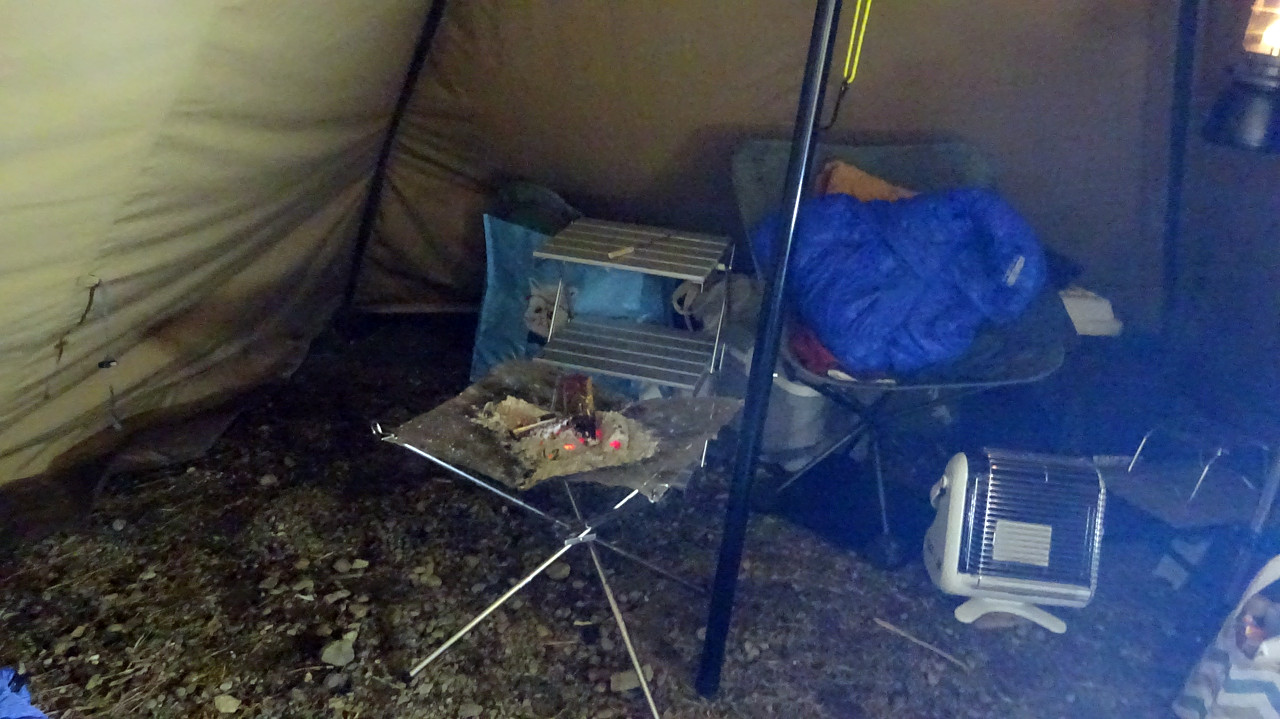 風が吹いて寒いし、食べるものも食べたし、21時には各々のテントに潜り込みました。