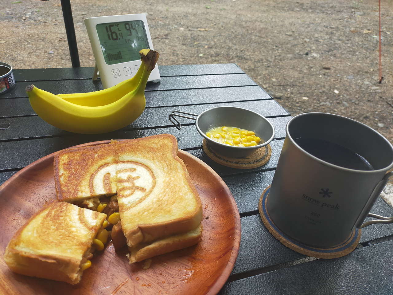 朝ごはんは焼き鳥の缶詰とコーンのホットサンド。
