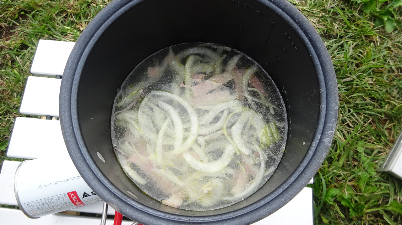 玉ねぎ、ベーコン、にんにくチューブをオリーブオイルで炒め、水と塩を投入。