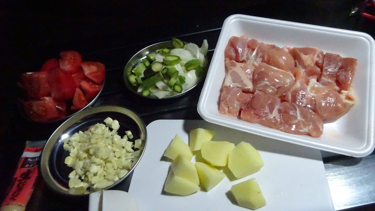 大量のトマト、玉ねぎ、アスパラ(昼の余り)、鶏肉、にんにく、ジャガイモ。