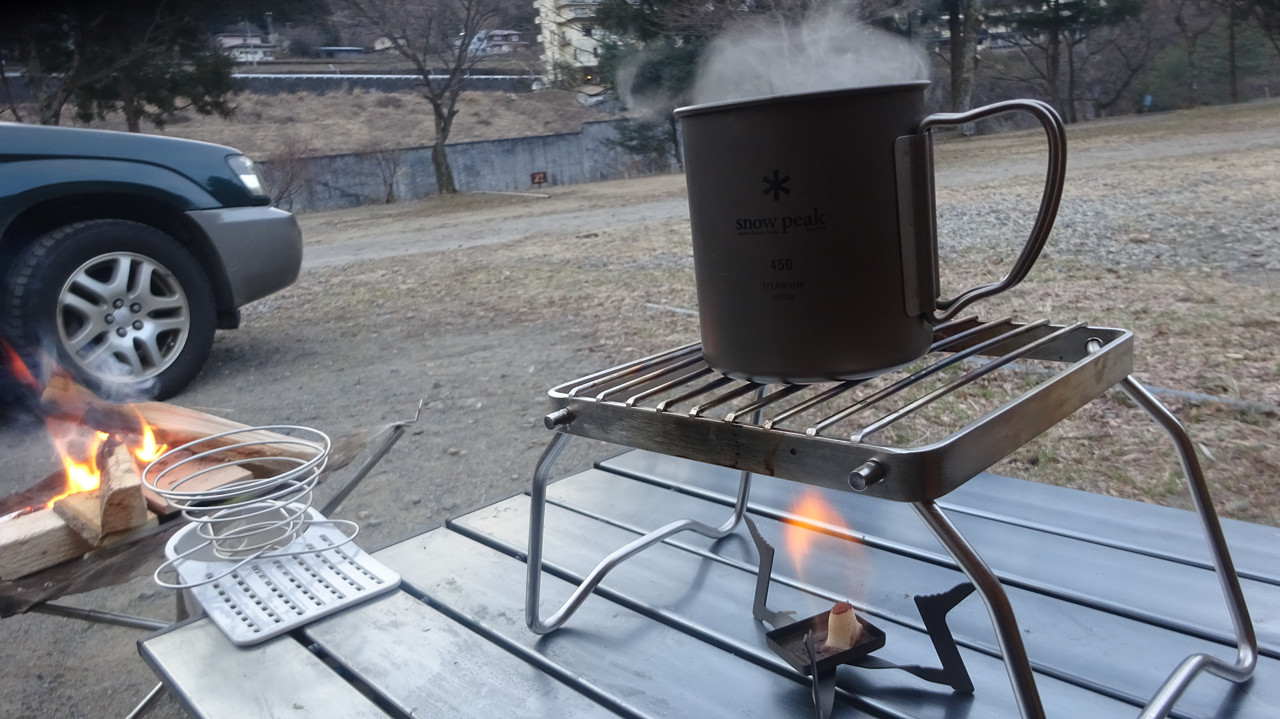 下から少量の固形燃料をあててコーヒーが冷めるのを防ぐオリジナル技!