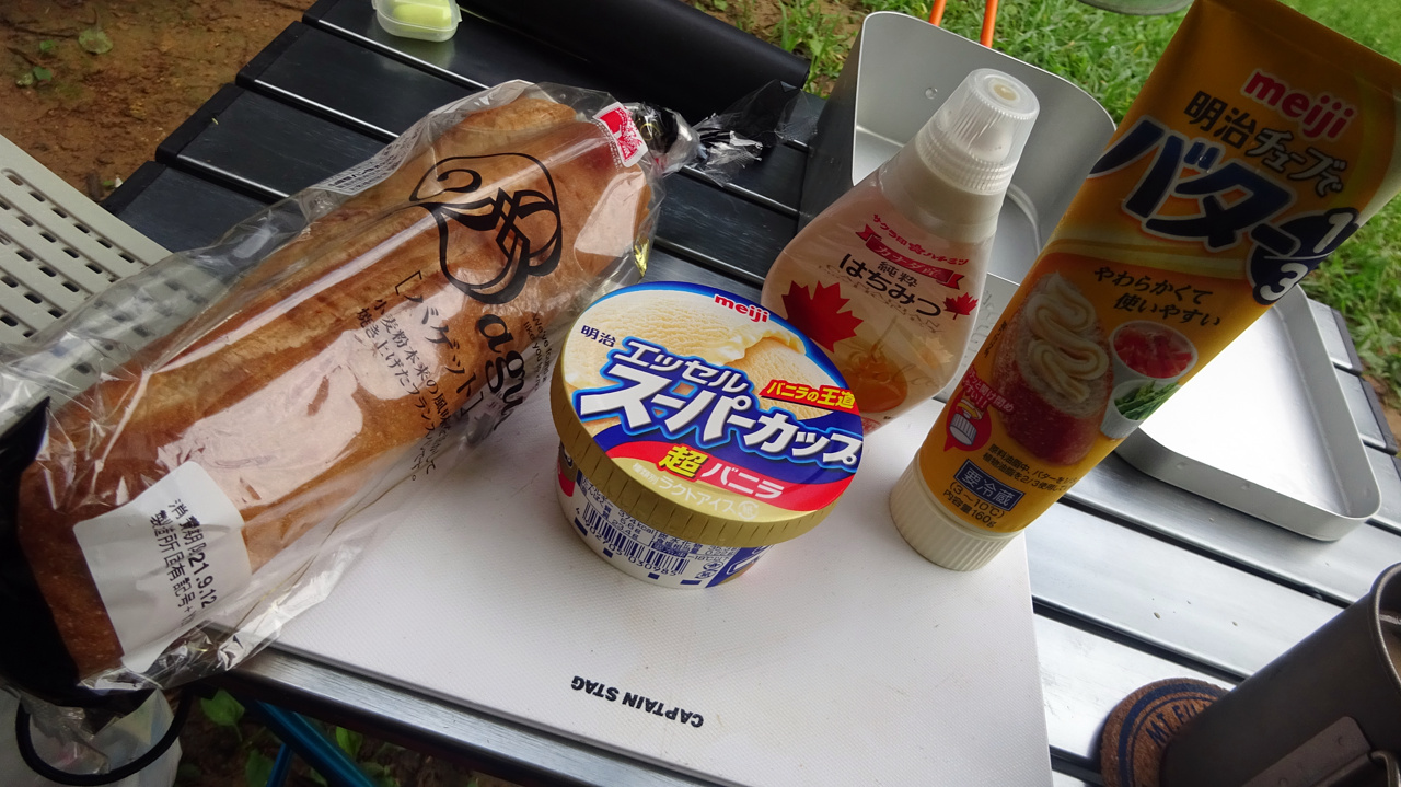 アイスはキャンプ場に来る前に近所のイオンで買って、クーラーに保冷剤&氷と一緒に入れてたんですがやっぱり2日目の朝には溶けてましたね。