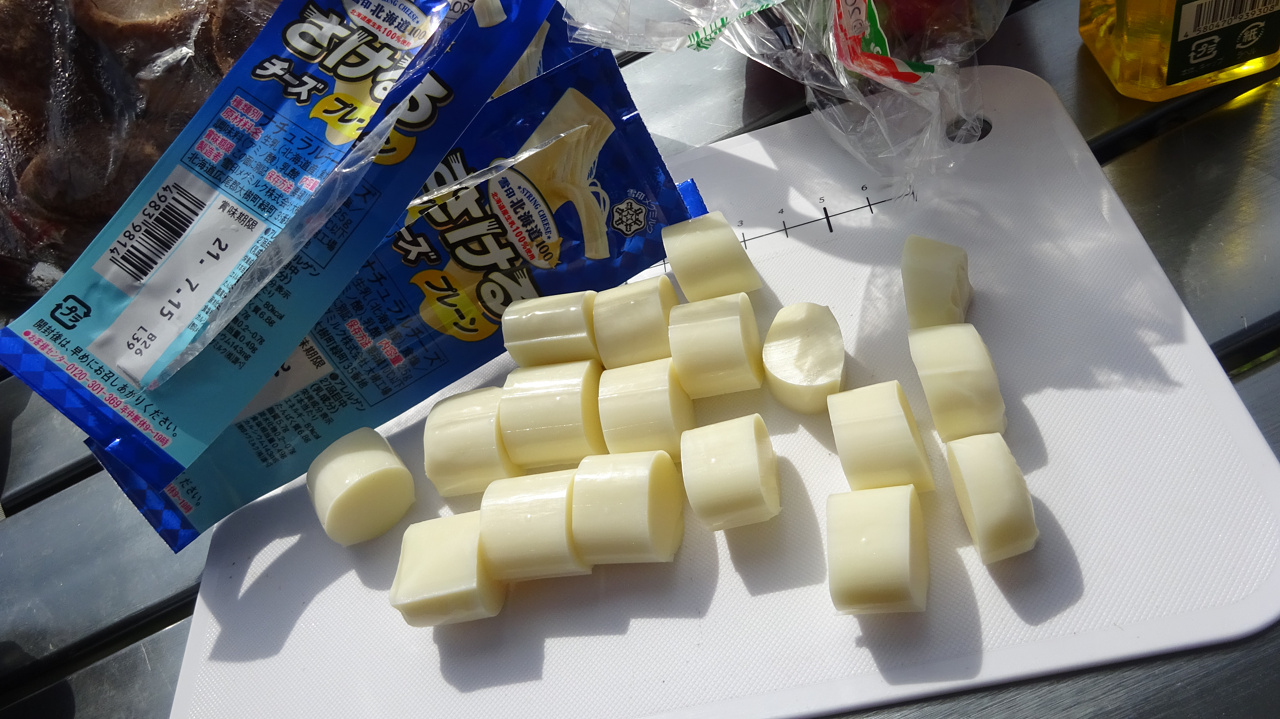 さけるチーズを、割かずに切ります。
