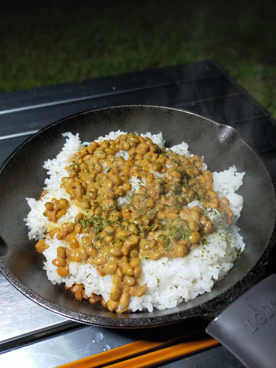 十分に温めたスキレットに油をひいて、納豆を軽ーく炒めます。
