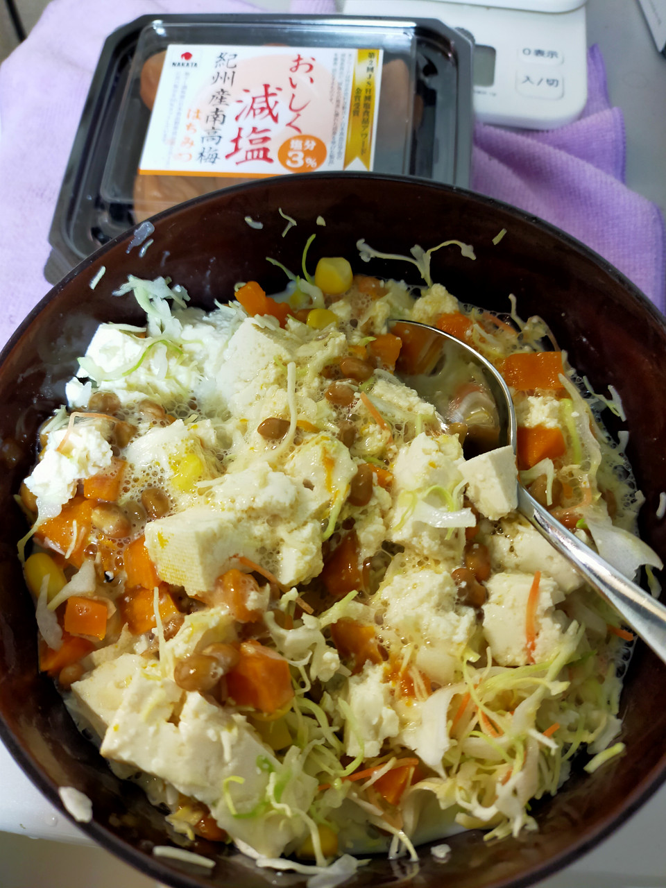 豆腐1斤の半分、納豆パック3つ、コールスローのパック半分に牛乳を入れて混ぜ混ぜしてみました。