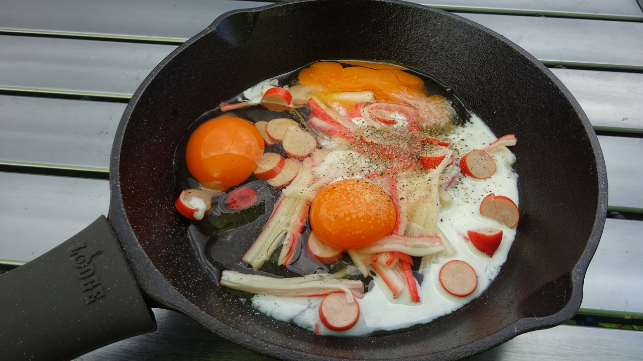 ウィンナーと海鮮スティックを切り、卵と牛乳に入れて塩胡椒をまぶして混ぜます。