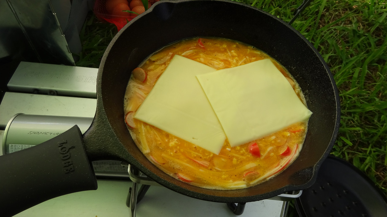 軽く熱したらスライスチーズを入れ、溶けてきたらかき混ぜます。
