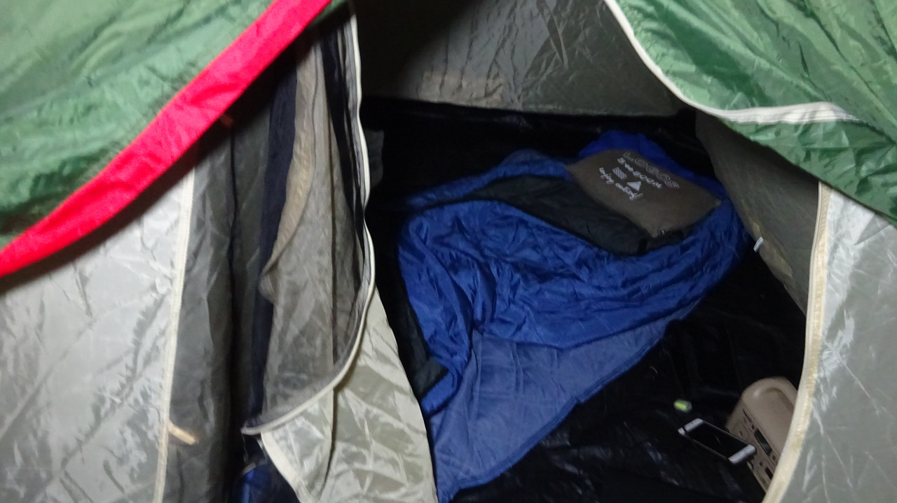 そういやシュラフの下の毛布の下に敷いてるインフレータブルマットが、穴が開いてるかなんかで朝にはしぼんでしまいました。