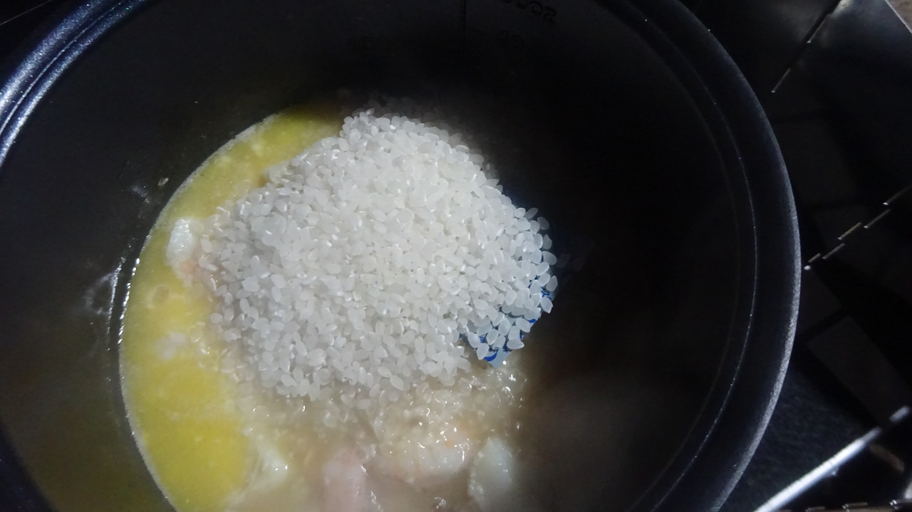ホントは水はちゃんと計って入れる訳だけど、なにぶんシーフードミックスから出る水分量が未知数なので、そこはどうしても目分量に。