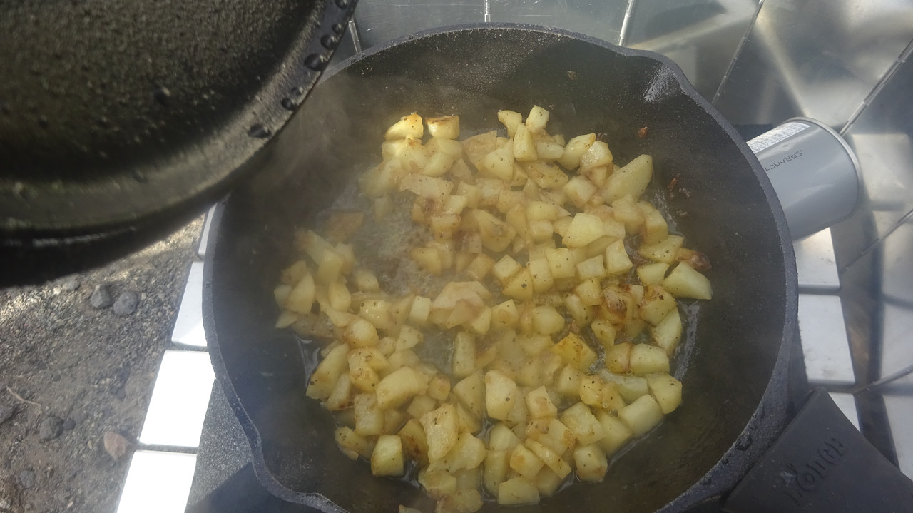 ジャガイモと少しの炒めた玉ねぎをオリーブオイルで炒めます。