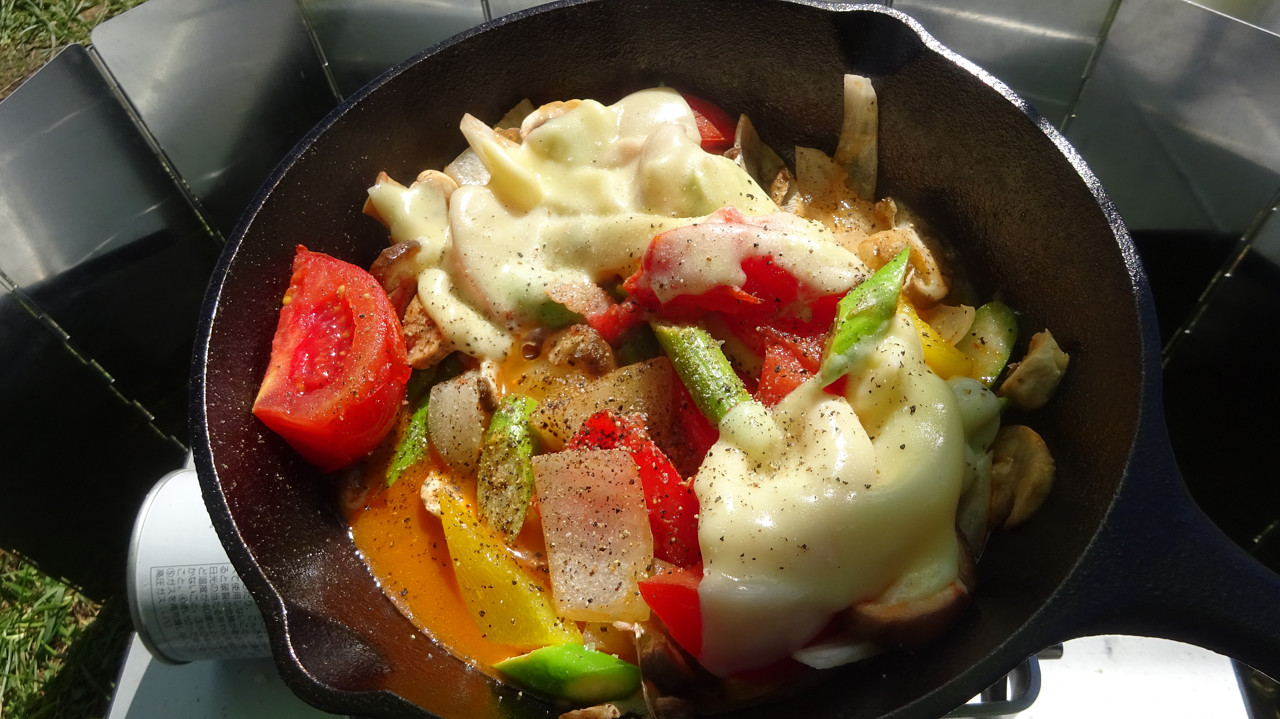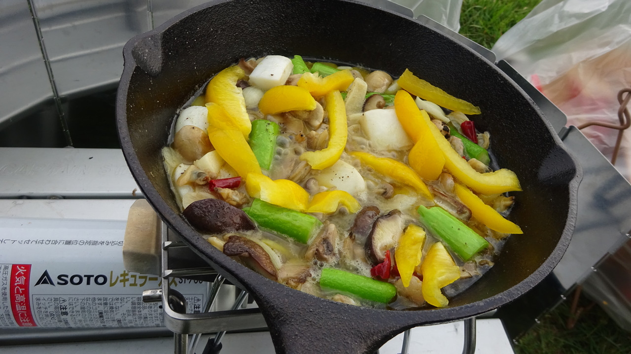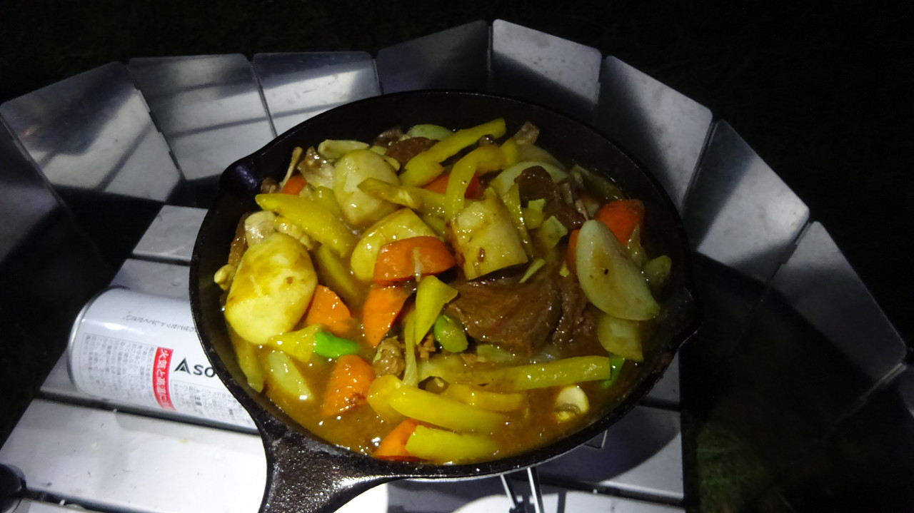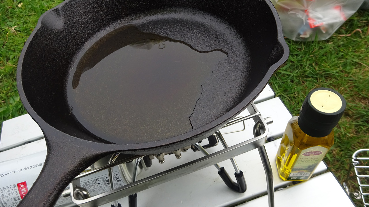 拠点に戻り、この前のキャンプでシーズニングしたスキレットを初使用。