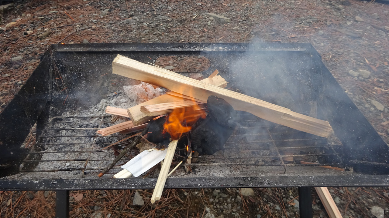 割りばし、フェザースティック、その辺の松葉、いろいろ併用してようやく焚火が付きました。