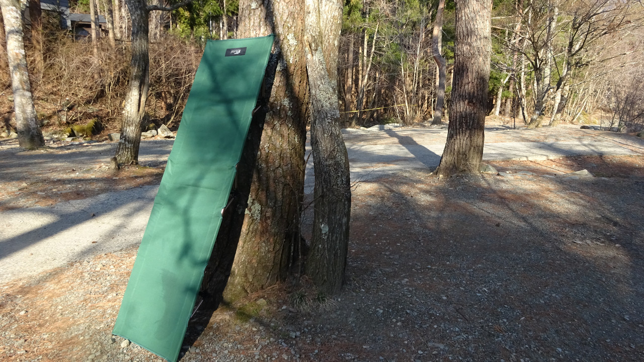 テントの中にこのコットを置いて、封筒型のシュラフを敷布団&掛け布団にして、マミー型のシュラフで寝てます。