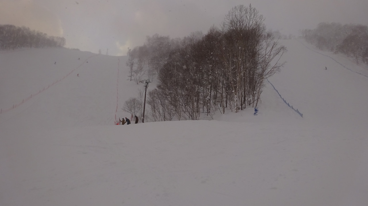 真ん中左の2人(3人目は関係ない人)は、向かって左から右に林を突っ切ろうとして失敗して戻ってきてコース外の非圧雪で難儀しているの図。