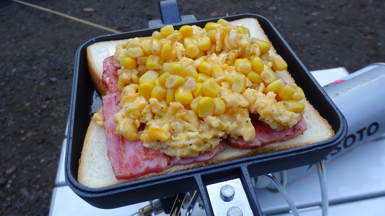 トーストにスライスチーズ、厚切りベーコン、卵焼きに缶詰のコーン。