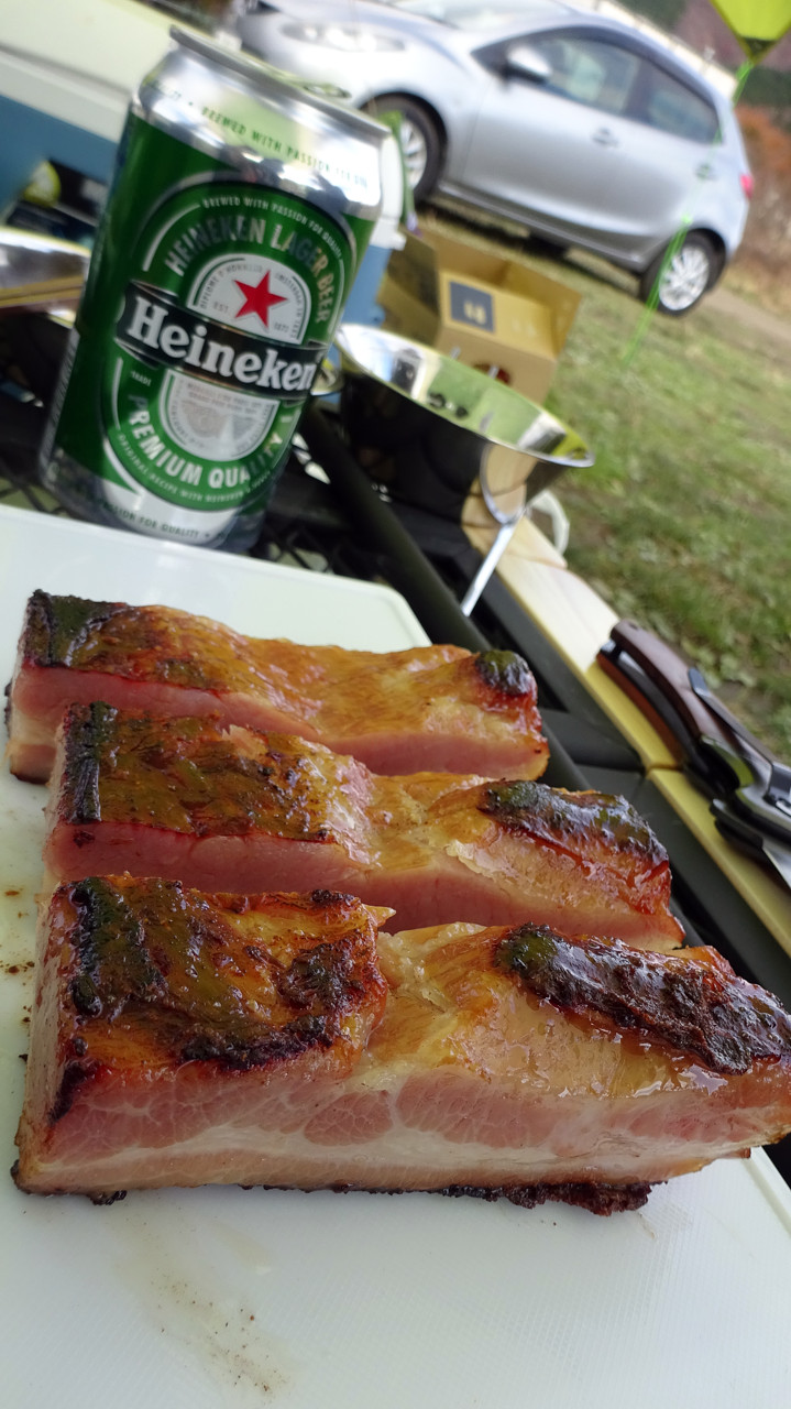 道中の、道の駅朝霧高原で購入したベーコンをまずいただきます。