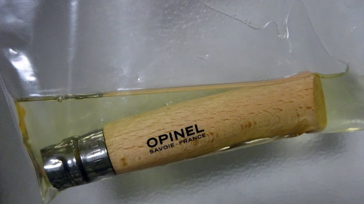 オピネルのナイフの油漬け。