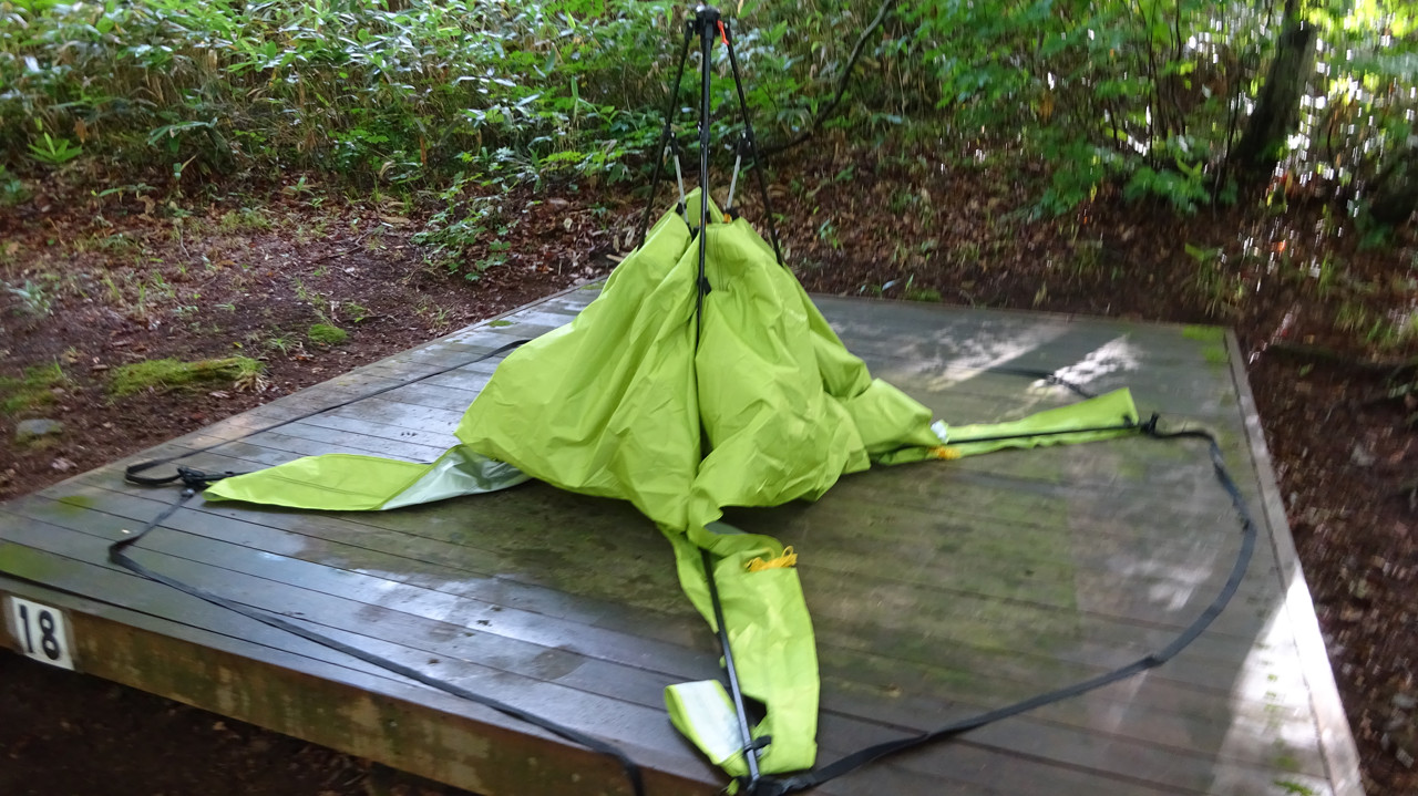 以前のテントは対角線じゃないと延ばせなかったので、ソコは良くなりましたね。