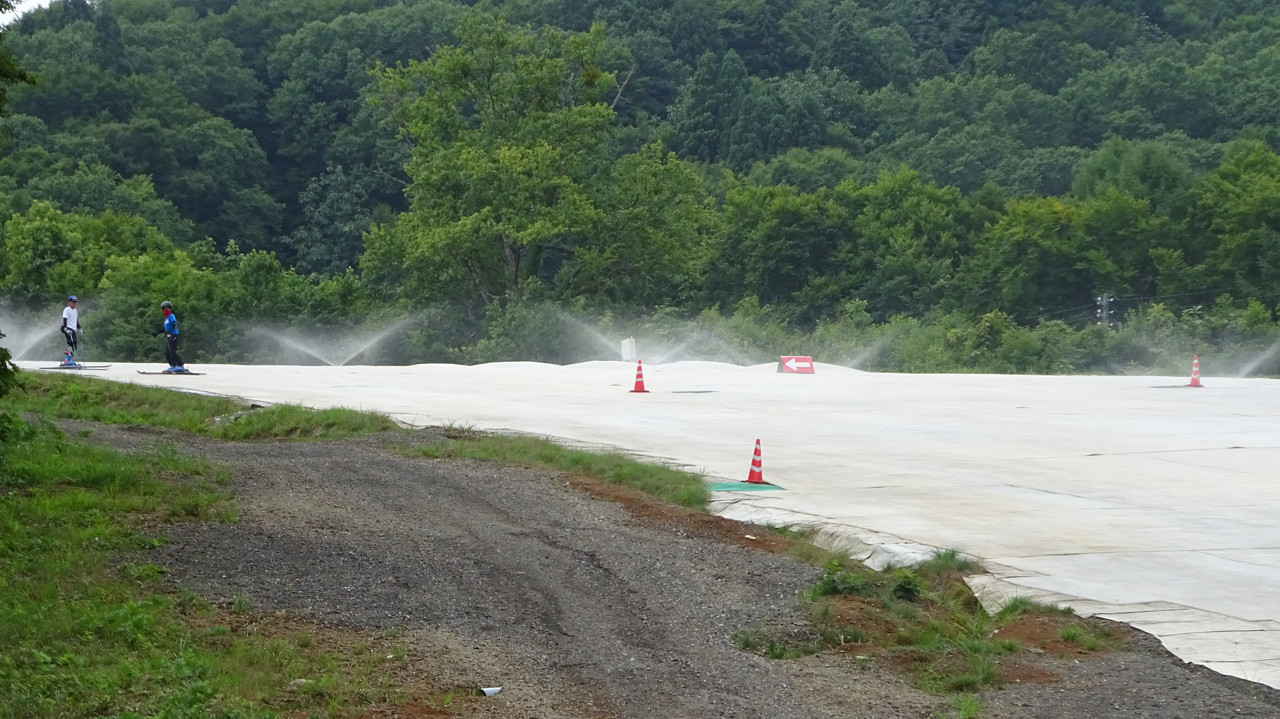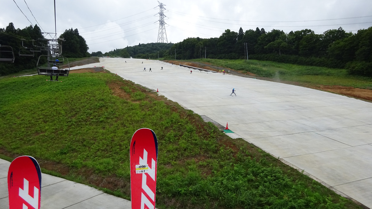 ここを夏スキー専用のシリコンを塗った板で滑ります。
