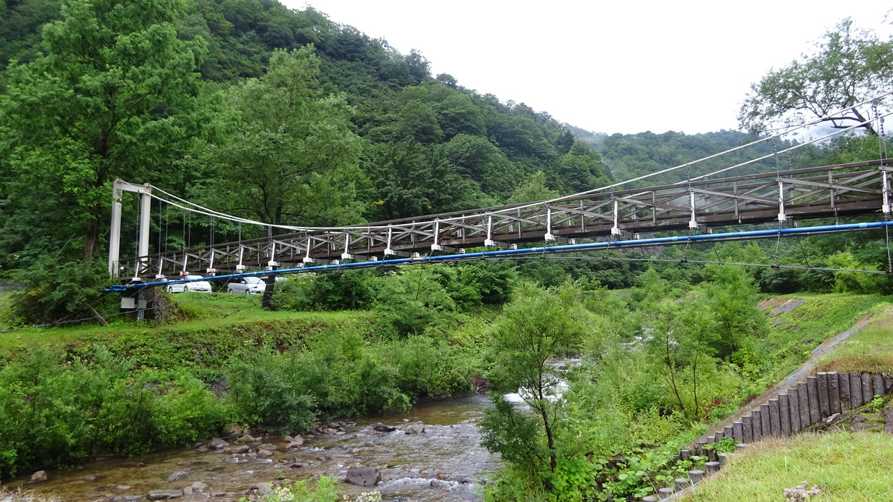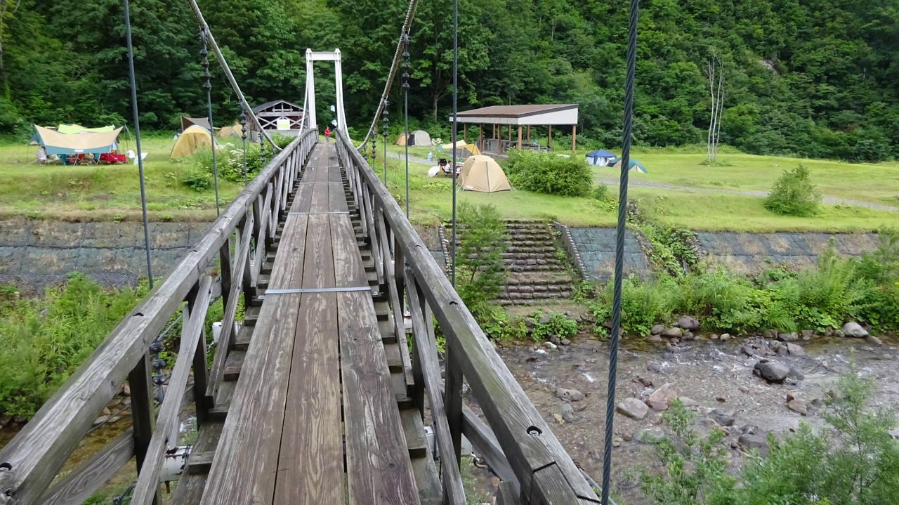 奥のほうのフリーサイトは、こんな感じで駐車場とテントサイトの間につり橋があります。