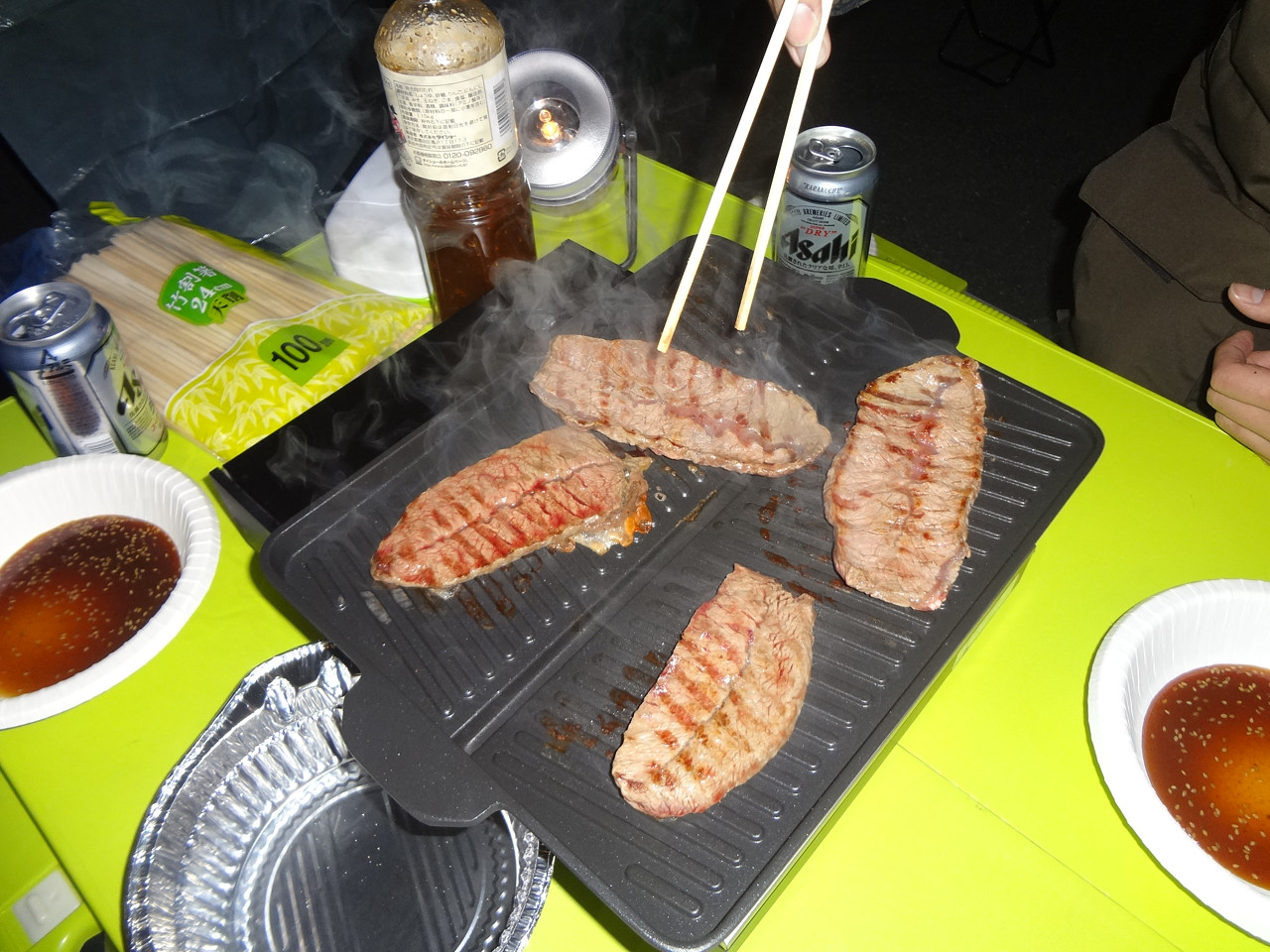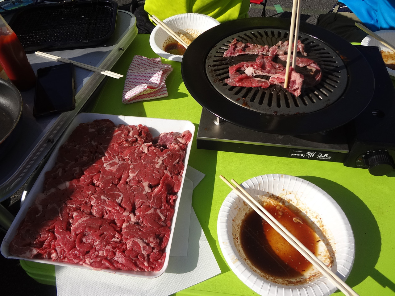 机2つを並べてカセットコンロで焼肉パーティ。