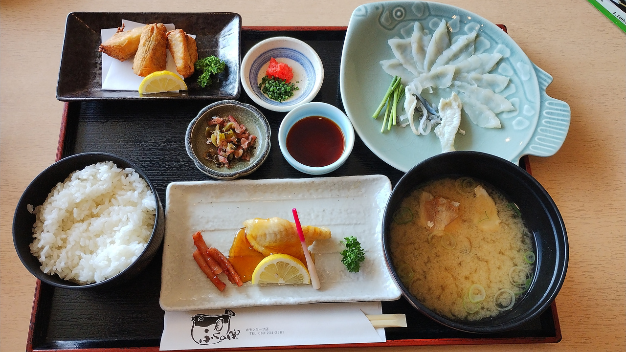 フグの刺身、空揚げ、南蛮漬け、お味噌汁が味わえます。