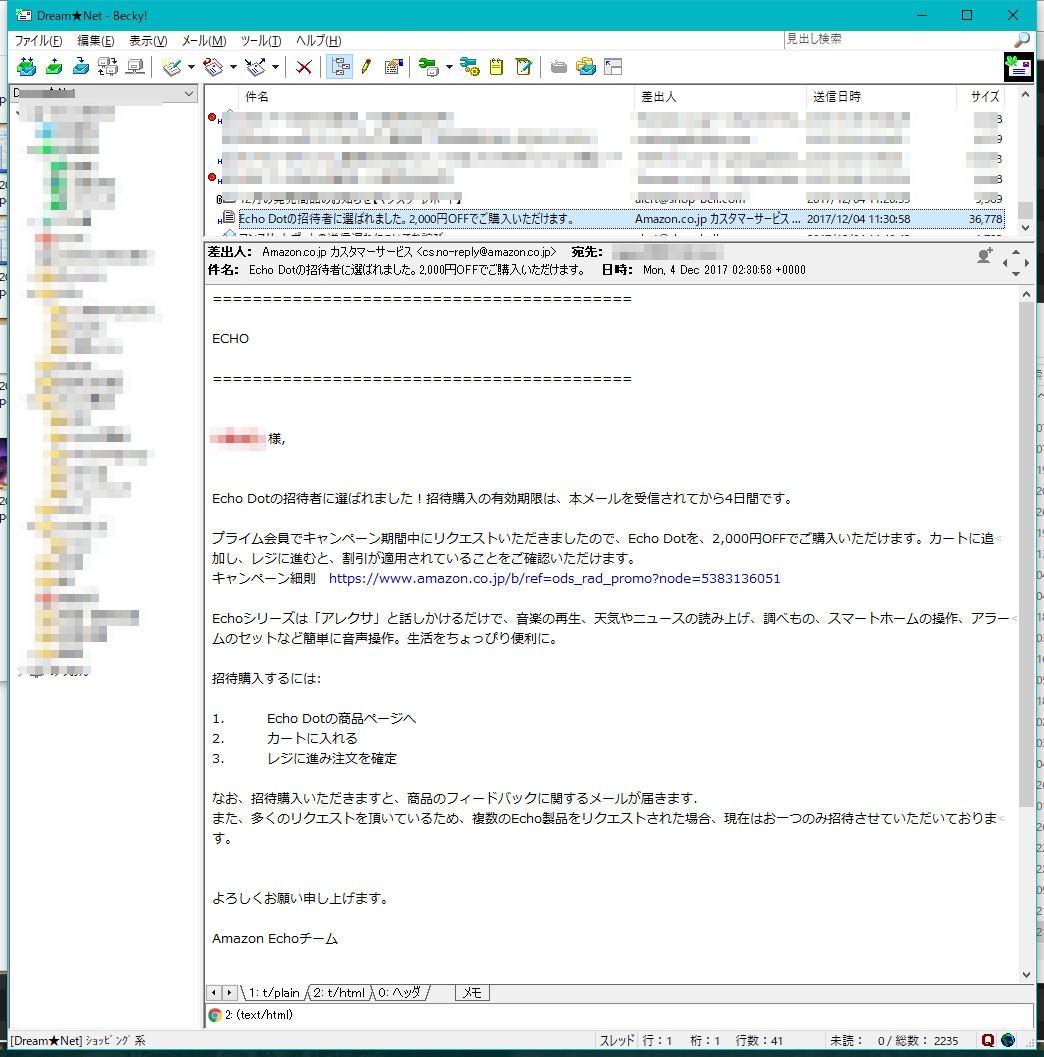 Amazonのプライム会員だと、最近話題のスマートスピーカー Amazon Echoを割安で買えるチャンスがあったんですが、今日そのメールが届きました。