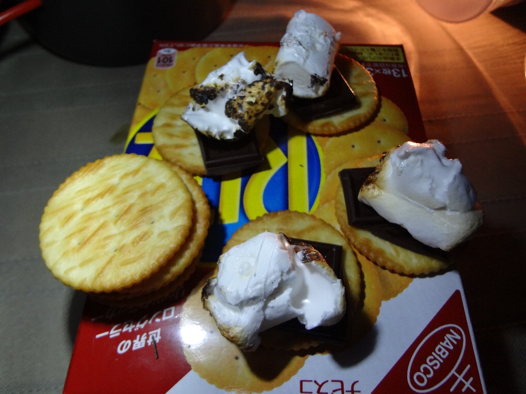 マシュマロを焼いてクッキーとチョコで挟んだお菓子。