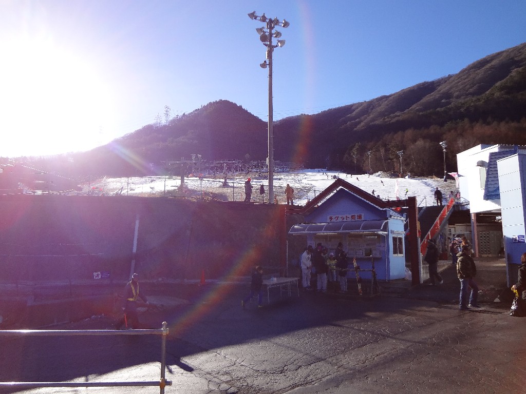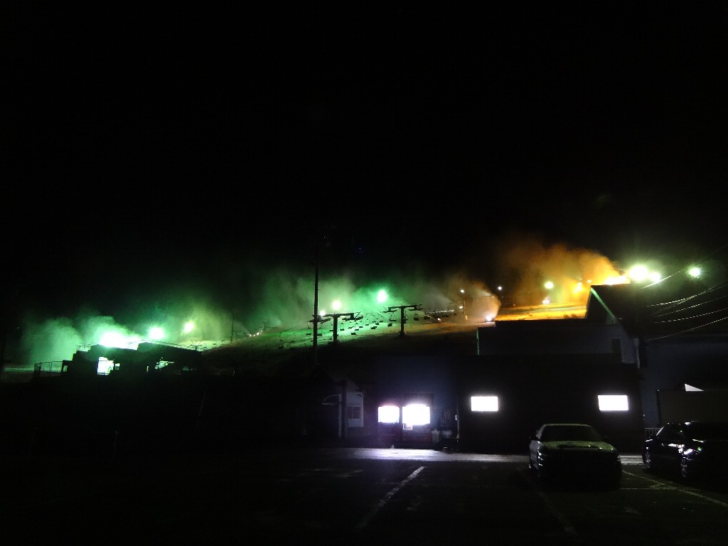 駐車場の向こうの斜面では人工降雪機がフル稼働中、ある意味幻想的な光景でした。