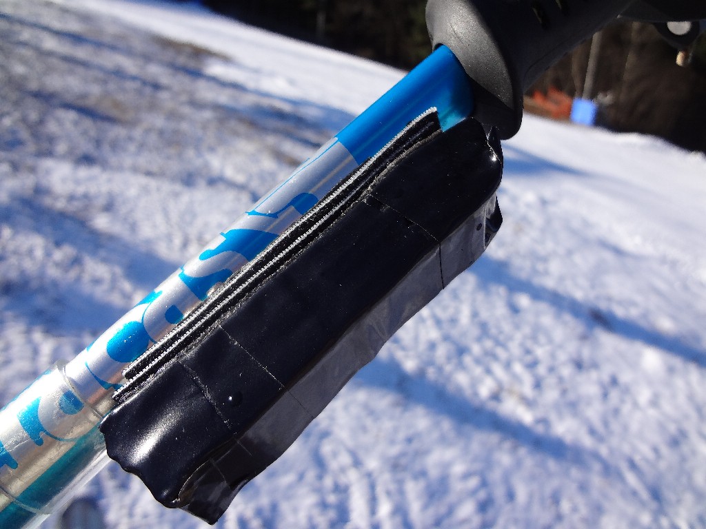 撮影してないけどストックの雪に近い側にも板重りを巻いてバランス取ってます。