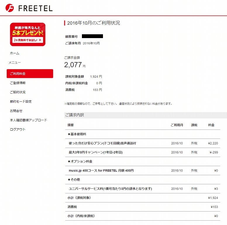 9月にも確認してたんだけど、DocomoからFREETELに替えたスマホの料金をチェック。