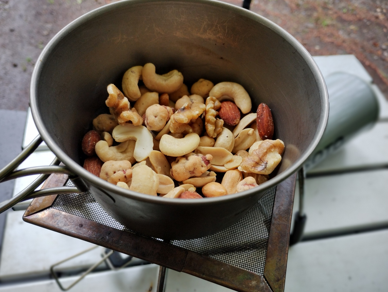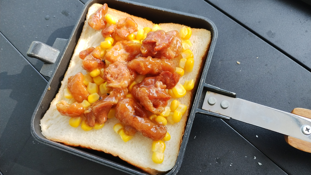 ということで、缶詰のコーンと焼き鳥でホットサンド。