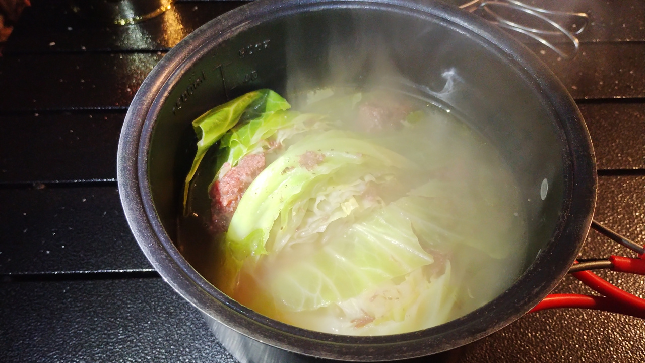 それを鍋に入れ、水と塩コショウ、コンソメで煮るだけ。