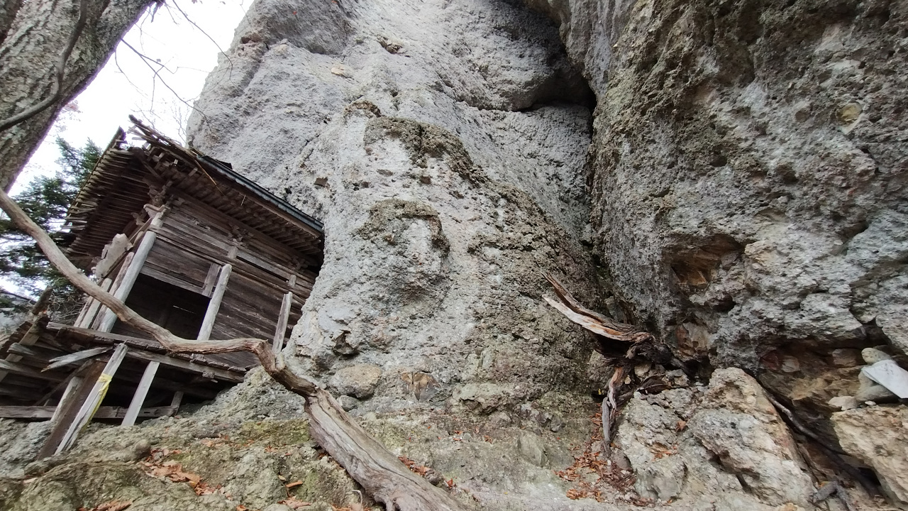 ようやく岩肌に建物が見えてきます。