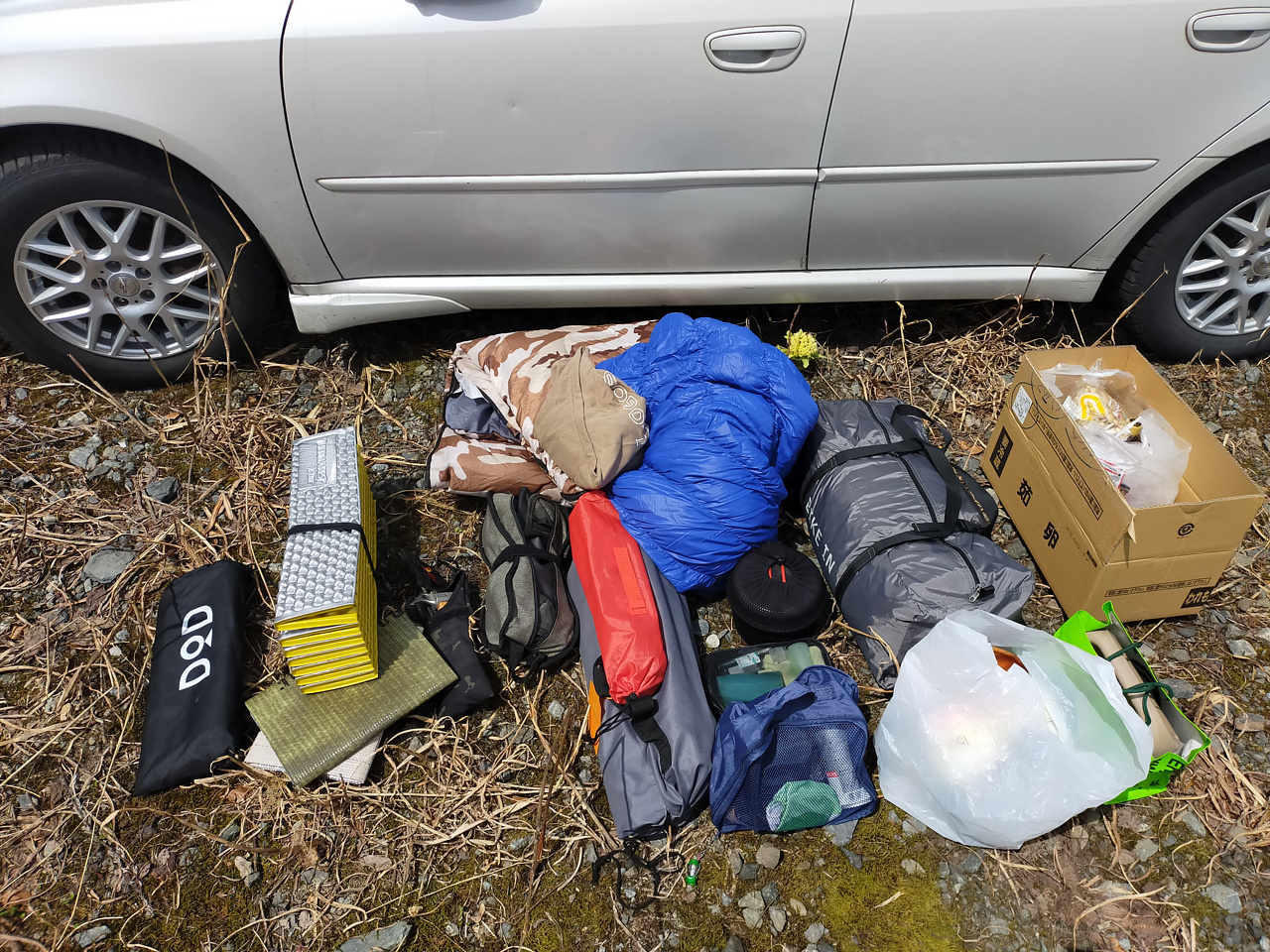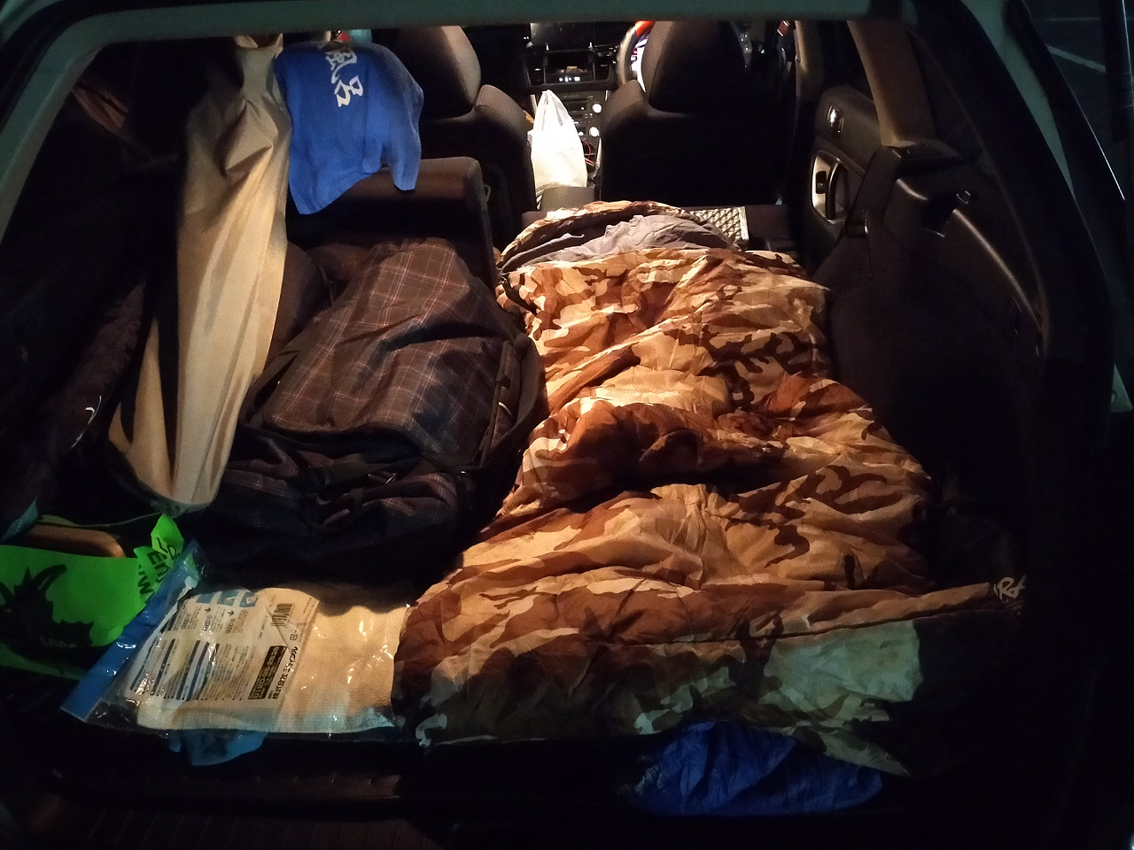 後部をフルフラットにして、マットと寝袋を敷いて準備万端。