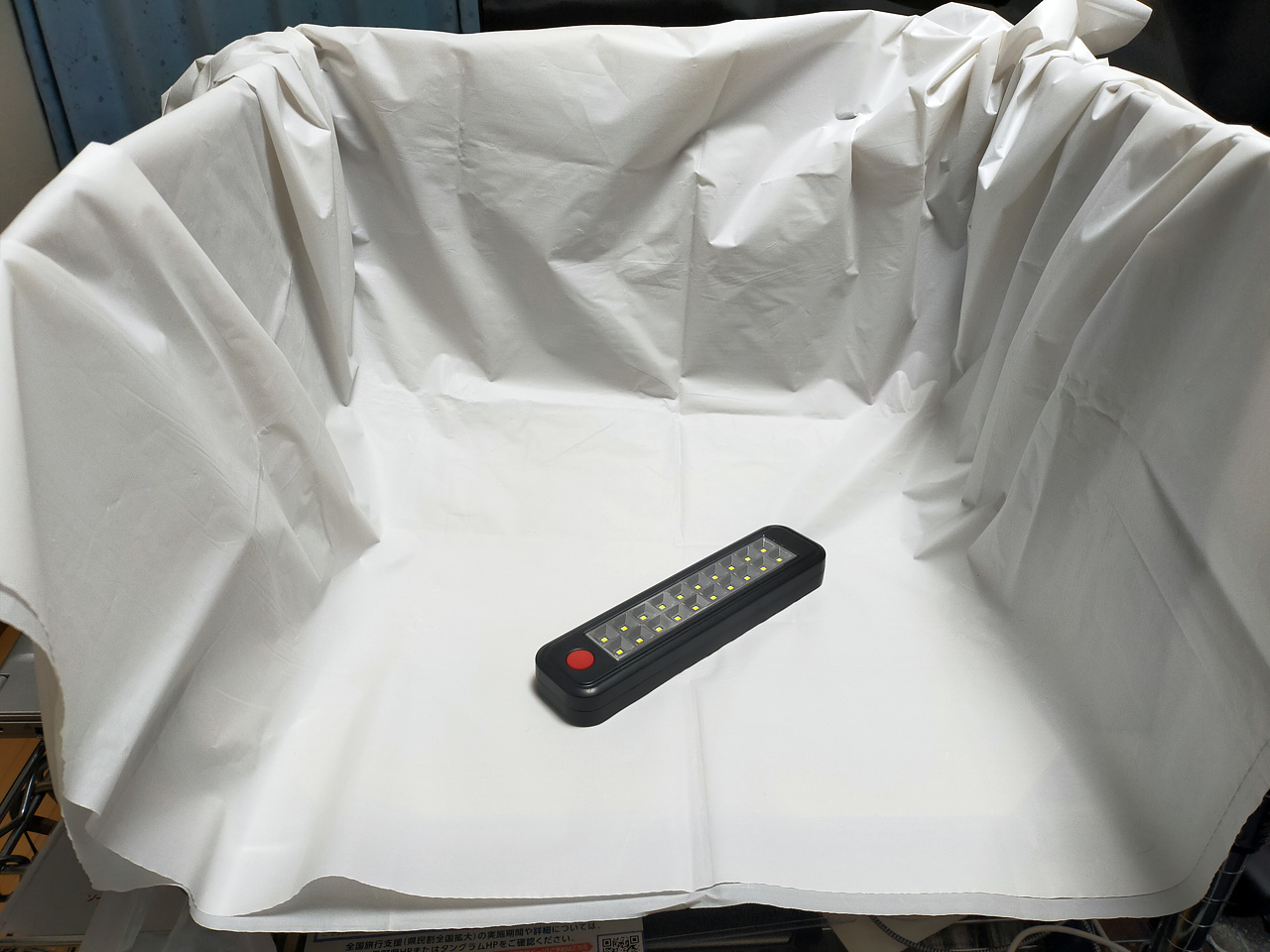 と、ダイソーで買った白い布と、ホームセンターで買ったライト。