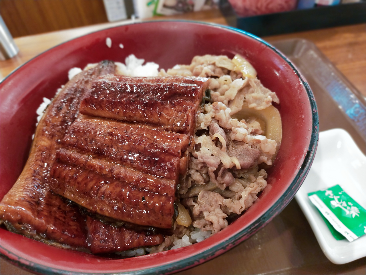 ついでに、やっぱりうな丼と牛丼は別々に食べたほうが、味が混ざらなくていい気がするなあ。個人的にだけども。