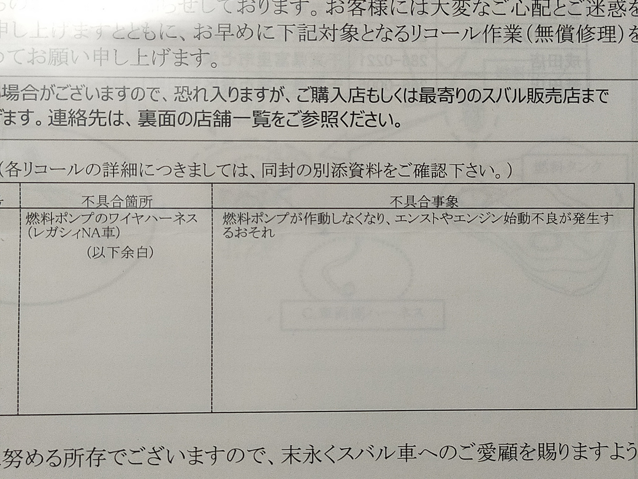 実は1月に買ったこのレガシィツーリングワゴン、買うときにリコール対象である旨を伝えられてました。