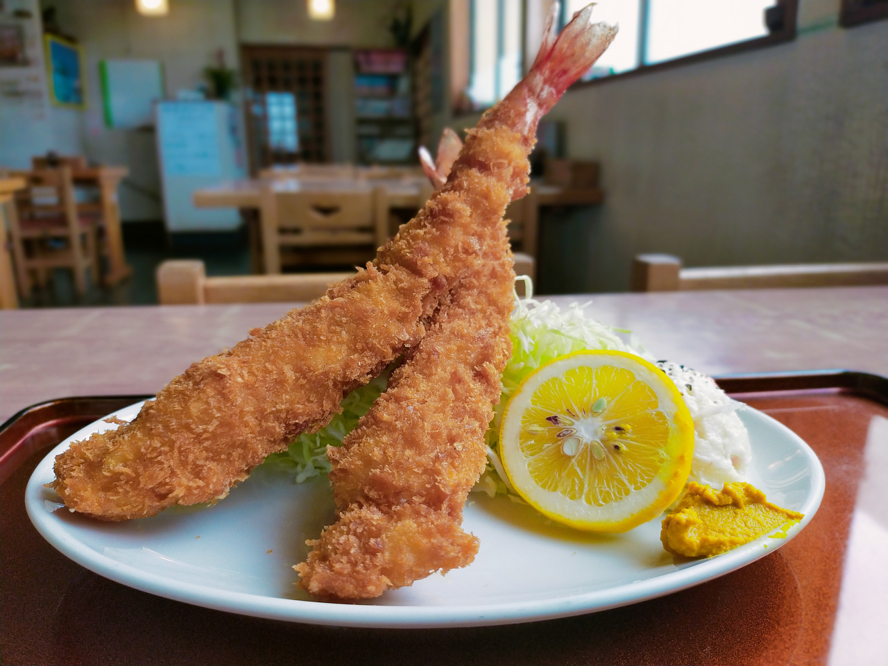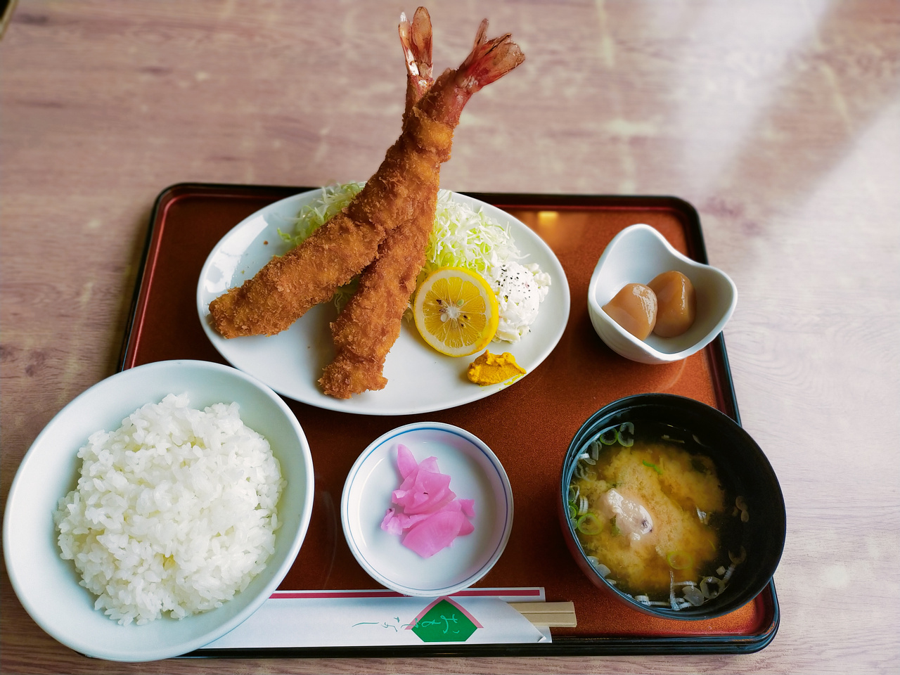 天然特大エビフライ定食。