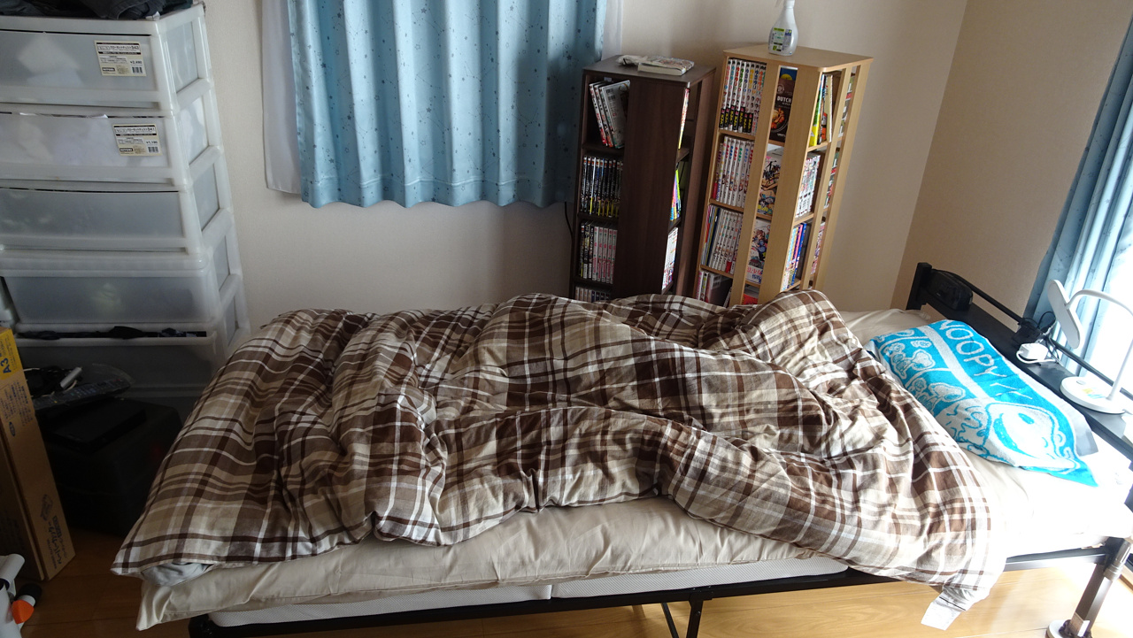 電気毛布とファンヒーターの近代装備で暖を取りますよ。