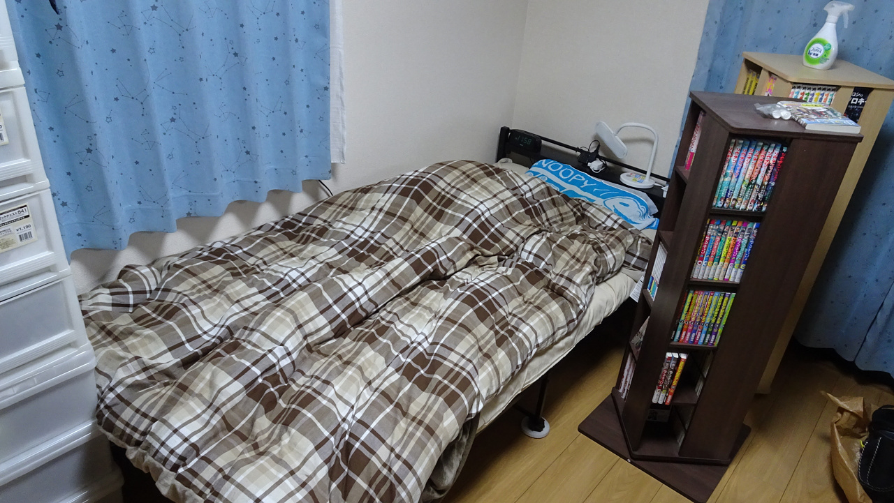 回転本棚がなぜかベッドの向こうにあるんですね。