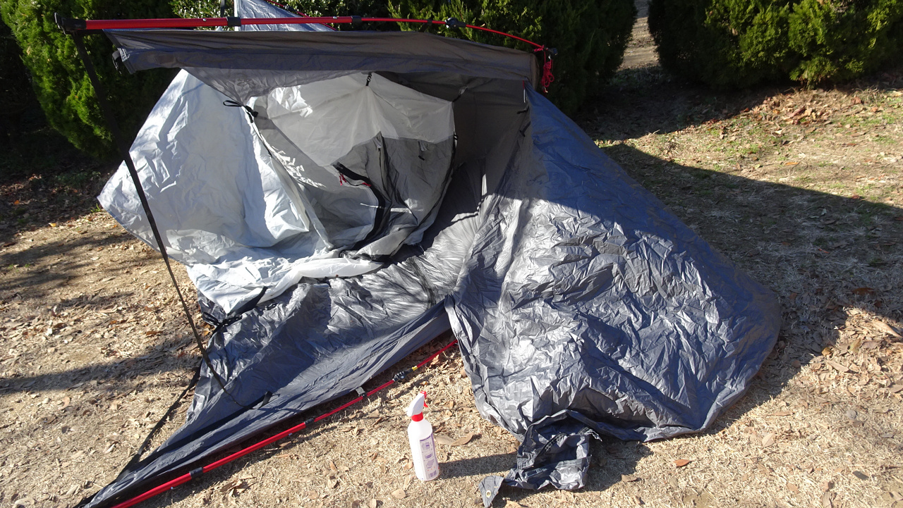 家で吹き付けて来いという感じですが、現地でテントを横にして裏から吹き付けます。