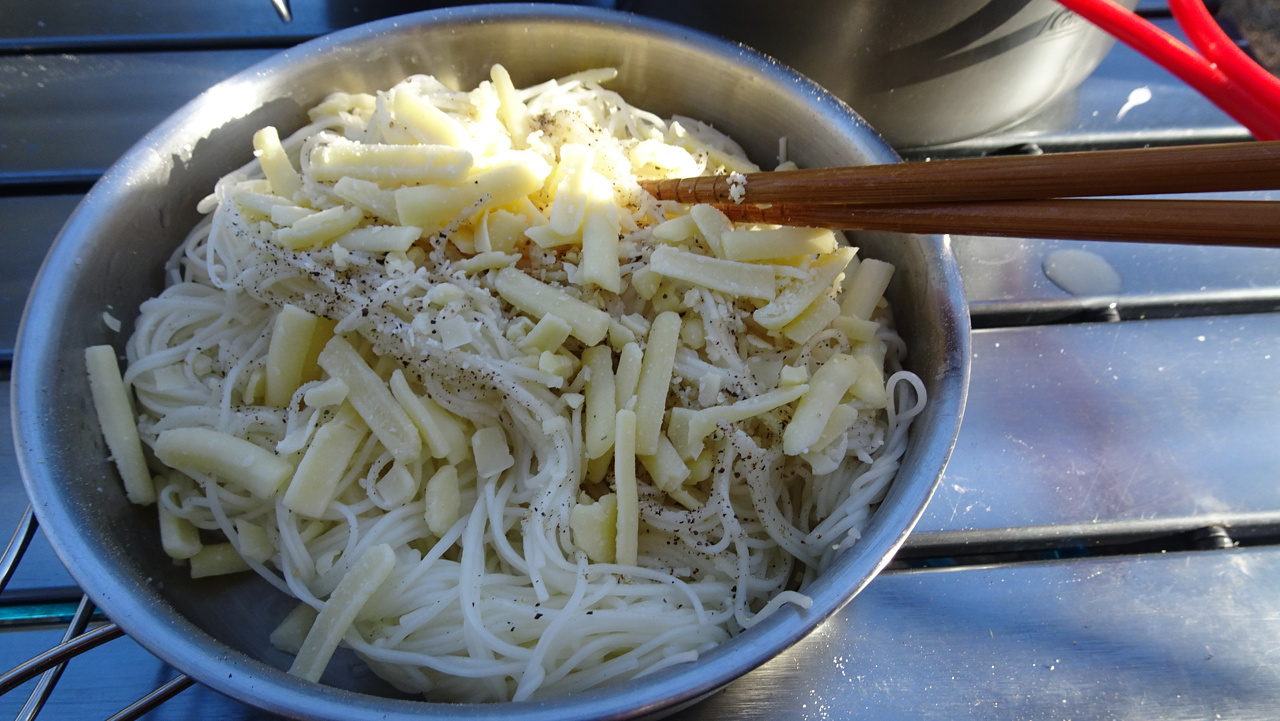 茹でた素麺と溶いた小麦粉、チーズ、塩胡椒を混ぜ混ぜ。