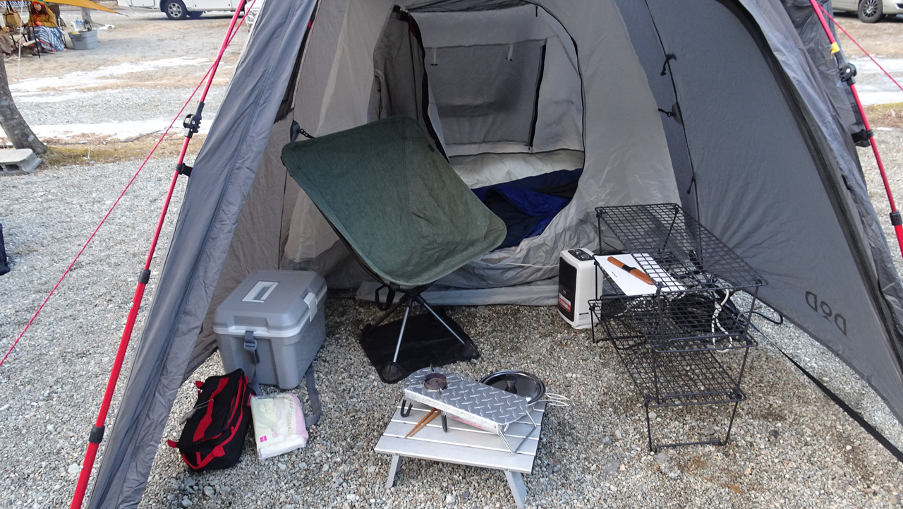 右端にコードが出てますが、AC電源付きなので中でファンヒーター動かしてます。