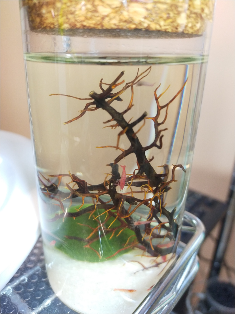 ホロホロシュリンプとかスカーレットシュリンプなんて呼ばれたりもするエビで、このボトルの中で生態系が保たれてて、餌をあげなくても水を変えなくてもエビが生活できるっていうやつ。