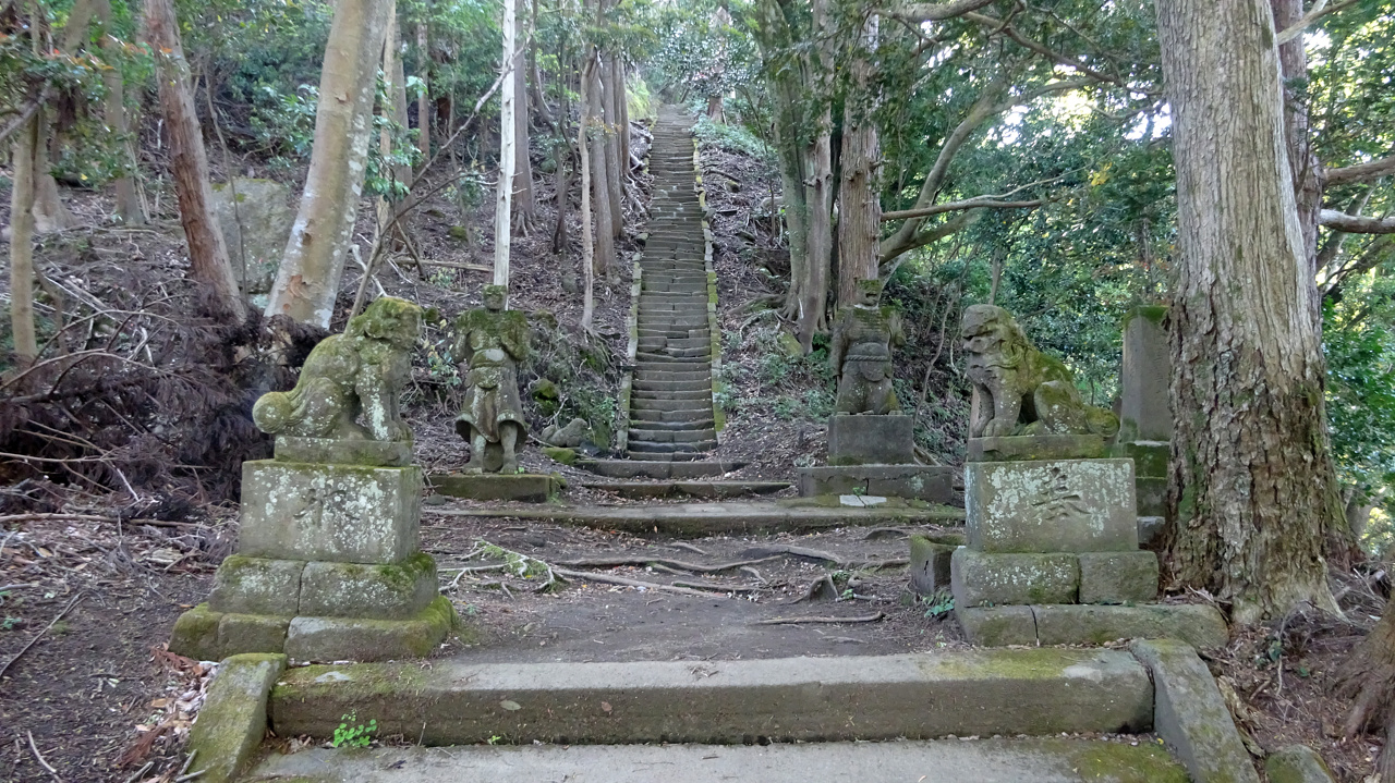後ろの2体の彫像さん、阿吽像らしいですがこちらも風化&苔むして時代を感じさせます。