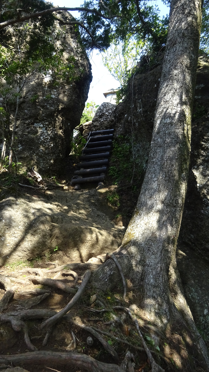 山頂の道標を過ぎるとすぐ、狭いところに階段がかけられてました。