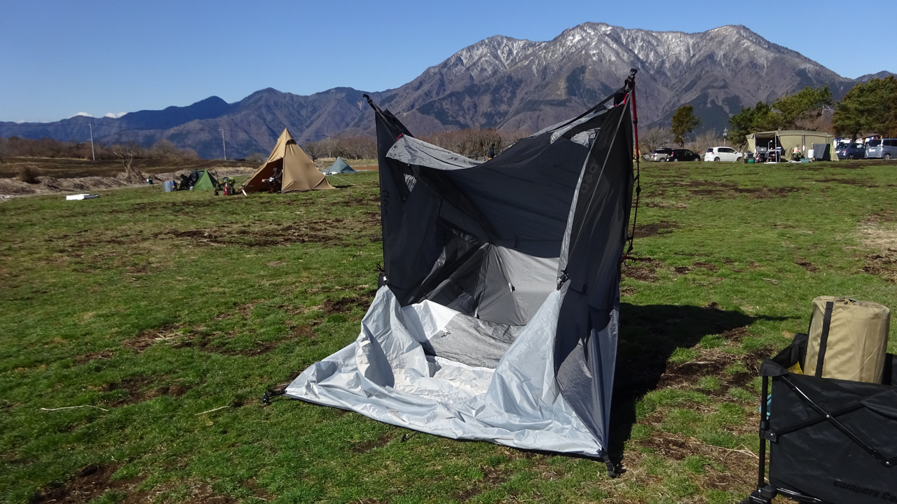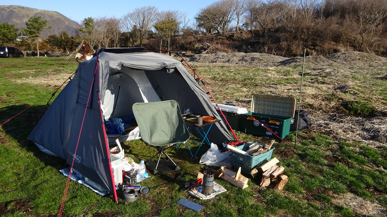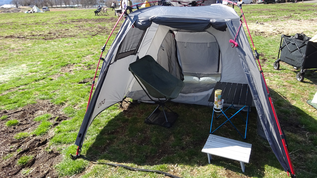 他に10組ほどキャンパーが来ていて、先に陣地を主張したほうがよさそうだったのでまずテント設営。